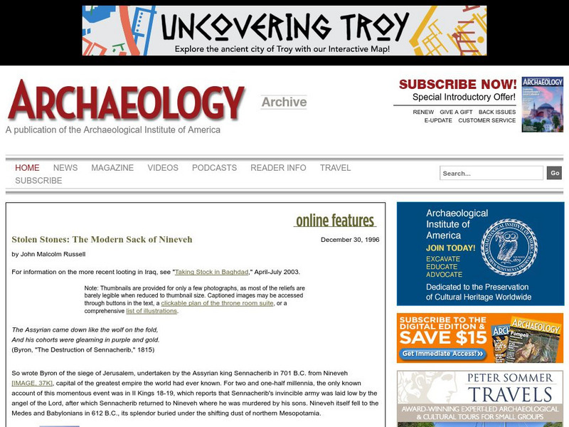 An article about stolen Assyrian artifacts. It has many links to photos of Assyrian art and architecture, along with detailed images and illustrations.