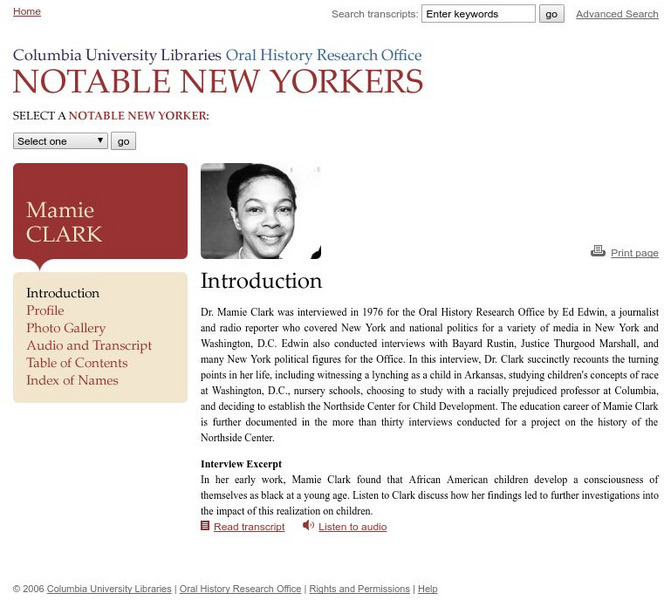 On this website you can read about Dr. Mamie Clark, distinguished African-American educator, and hear an interview with her about her studies of race and child development. This interview is part of Columbia University's Oral History...