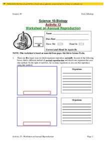 In this reproduction worksheet, pupils identify the 5 major ways organisms reproduce asexually and list examples of organisms that reproduce in that manor. Then students complete 10 short answer questions.
