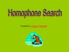 Homophones take center stage in this engaging, interactive slide show. Students see that homophones are words that sound the same, but are spelled differently and have different meanings. They consider 20 slides which have sentences with...