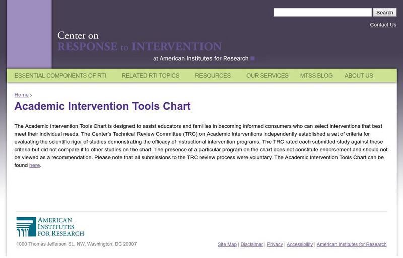 Center on Response to Intervention: Academic Intervention Tools Chart