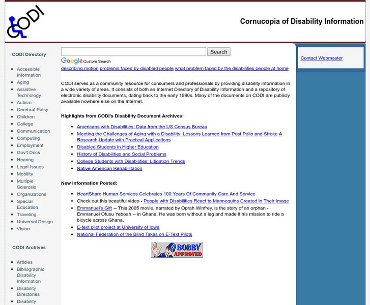 Site is an excellent resource for consumers and professionals providing disability information in a wide variety of areas. Many of the documents on CODI are publicly available nowhere else on the internet. Links provided for detailed...