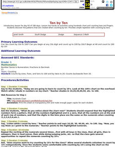 Learners participate in hands-on activities using a hundreds chart and counting toes and fingers. They discover the patterns that are created when counting by ten. After a lecture/demo, learners practice by using a worksheet embedded in...