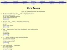 In this verb tense learning exercise, students complete a total of 18 multiple choice questions, selecting the correct verb to complete sentences. Students may click an "answer" button for immediate feedback, learning exercise is labeled...
