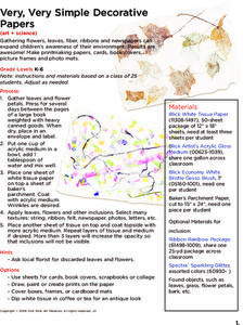 Elementary schoolers gather flowers, leaves, fiber, ribbons and newspapers to expand studenT awareness of their environment. They use these to make printmaking papers, cards, book covers, picture frames and photo mats. Beautiful results...