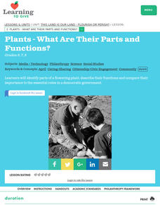 Students identify the parts of a flowering plant and their functions. They describe its life cycle as well. They compare the parts of the plant to the roles that are needed in a democracy.