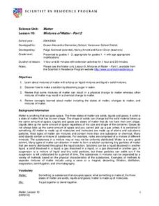 Students experiment with solids and liquids. In this mixtures of matter lesson, students combine matter to form solutions. Students hypothesize, test, and analyze the data to draw conclusions. The lesson can be extended by having...