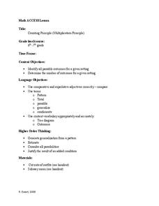 Students identify the different outcomes given a situation. In this algebra lesson, students calculate the possible outcome using the counting principle. They compare and analyze patterns to make their predictions.