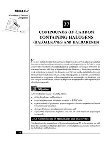 Halogens comes from a Greek word which translates to make salt. Lesson 27 in the series of 36 teaches pupils about halogens. Pupils read, discuss, and answer questions in order to learn about haloalkanes and haloarenes. From defining...