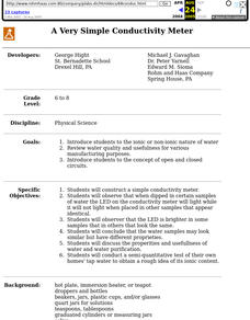 Students conduct a simple conductivity meter to test the ionic or non-ionic nature of water samples including one from their home.