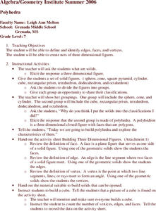 Students identify the parts of three dimensional objects. In this geometry instructional activity, students find the number of faces, edges and vertices. They differentiate between prisms and polyhedra.