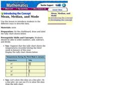 Fourth graders investigate when to find the mean, median, mode and range. In this statistical concepts lesson, 4th graders collect data, make observations and graph the data. Students verify their work on the computer.