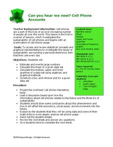 How sustainable are cell phones? Throughout the unit, learners explore the issues around cell phones concerning sustainability. Class members take a graphical look at the number of cell phones across the world using a box-and-whisker...