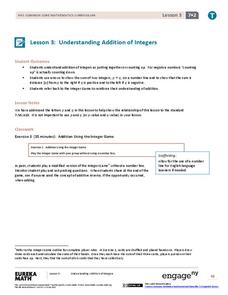 The second lesson in a series of 25 shows the class how to use arrows and a number line to add integers. Learners apply their knowledge of the commutative property and absolute value in their explanations. Classmates play the integer...