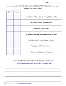 Practice punctuation as well as capitalization with a straightforward grammar exercise. Learners determine if several sentences use proper grammar or not and then write a sentence using correct capitalization and grammar.