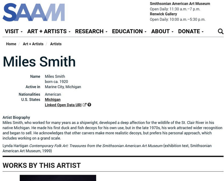 As part of the Smithsonian Art Museum's database of artists, Miles Smith is described here along with information on his contributions to art through his carving techniques and his duck and fish decoys.