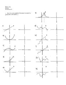 In this derivatives worksheet, students draw the derivative of each of eleven graphs. They interpret one graph by answering three short answer questions.