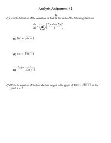 For this derivatives worksheet, 11th graders solve and complete 2 various types of problems. First, they use the definition of a derivative to find the variable expression shown for each function. Then, students write the equation of the...