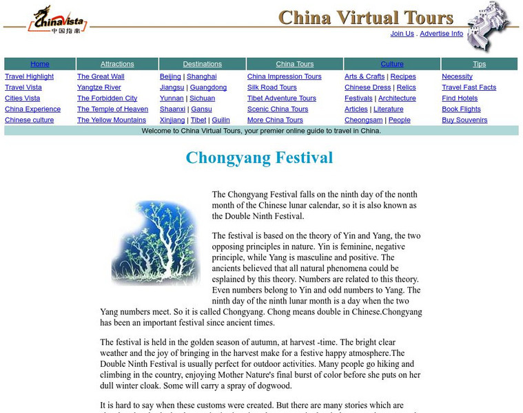 This site, which is provided for by Chinavista gives great information on the Chongyang Festival. The Chongyang Festival has been an important festival since ancient times. The story of Chongyang and how the customs were created are...