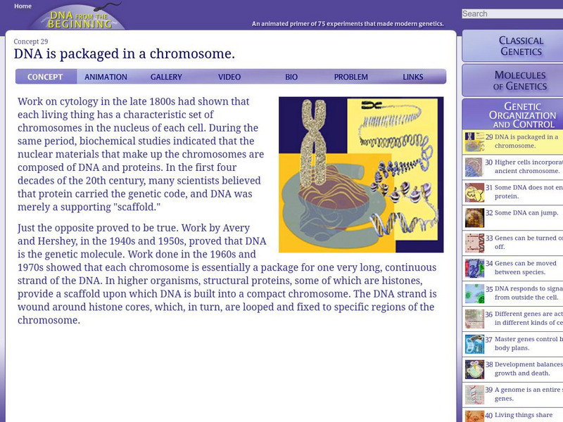 At DNA from the Beginning, choose from classical genetics, molecules of genetics, genetic organization and control. Each concept is explained through animation, an image gallery, video interviews, biographies and links.