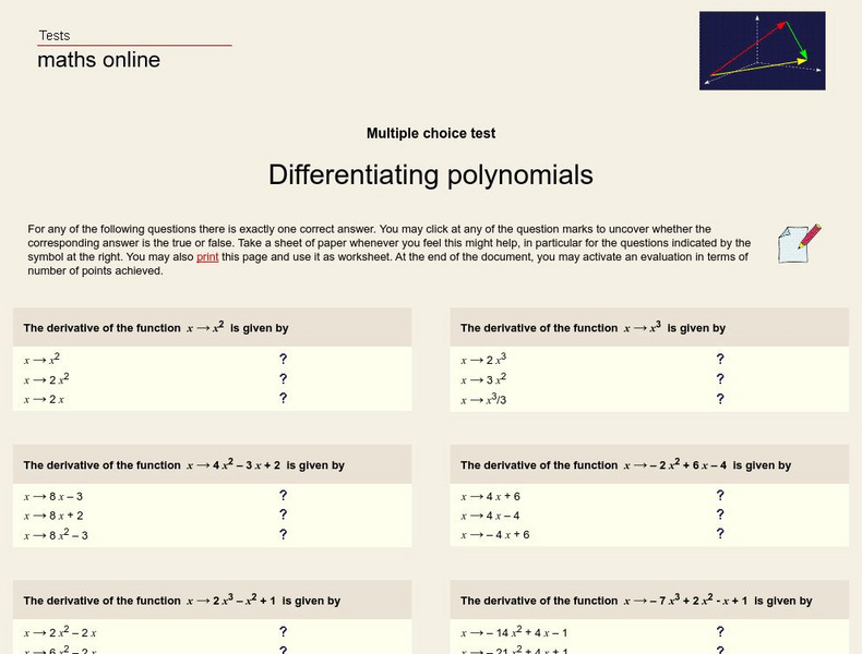 A series of multiple choice questions are given, each dealing with theoretical constructs of the derivative. These questions focus much more on concepts than mathematical manipulation. At the conclusion of the interactive quiz, the site...