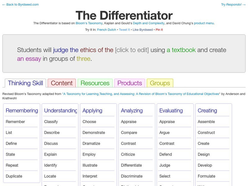 An interactive planning tool for teachers to develop differentiated lessons based on the revised Bloom's Taxonomy. Choose a thinking skill, then the type of content, the resources that will be used, the product students will produce, and...