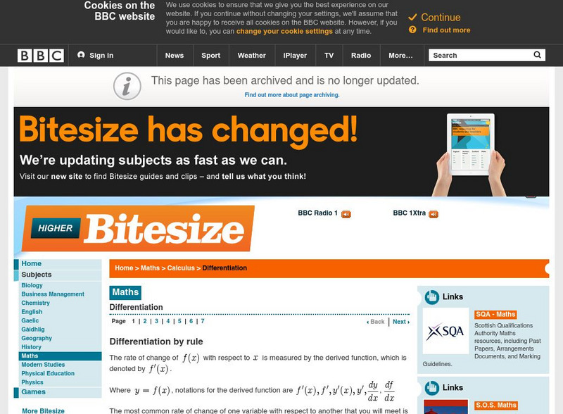 This site presents a tutorial on the topic of differentiation. Points of focus include rules for differentiation, tangents to curves, derivatives, increasing and decreasing functions, and optimization. Examples and a practice test are...