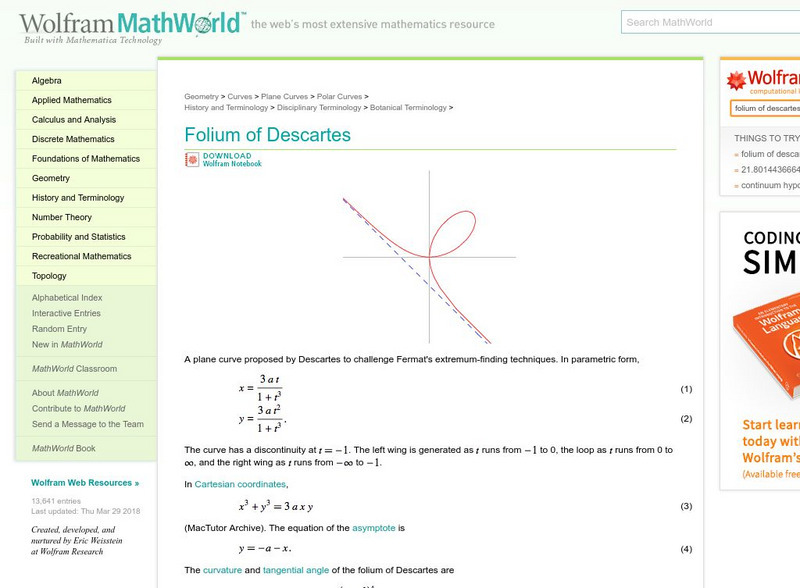 This site gives the parametric, cartesian, and polar equations for this plane curve. Also given is the point of discontinuity, equation for the asymptote, and area under the curve.