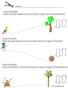 In this up or down direction worksheet, students read the directional sentence and trace the path to show the up or down direction. Students complete 3 examples.
