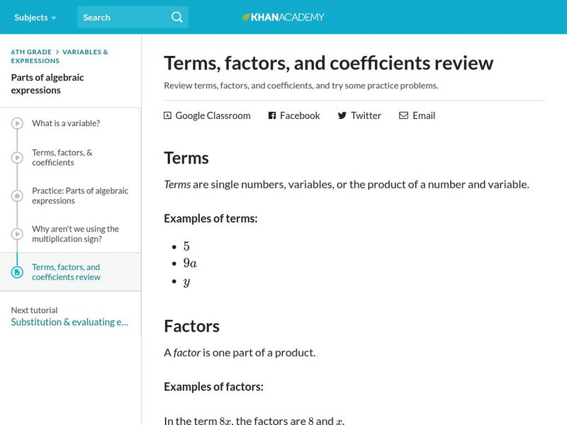 Khan Academy: Review: Terms, Factors, and Coefficients Review