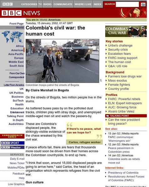 An article which describes the plight of the farmers in Colombia due to the Civil War. The writer also describes the government plan to fight the rebels (and drug lords), "Plan Colombia." The article is dated January 17, 2002.
