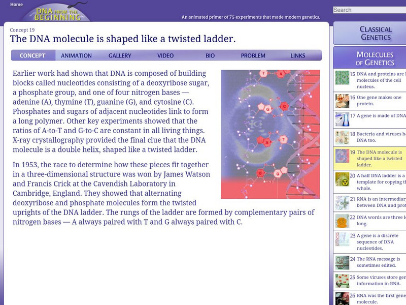 Instructional module focusing on the physical structure of DNA. Discussion incorporates the description of the nucleotides, base pairs, and the double helix shape of a DNA molecule. Site also includes an interactive practice quiz and...