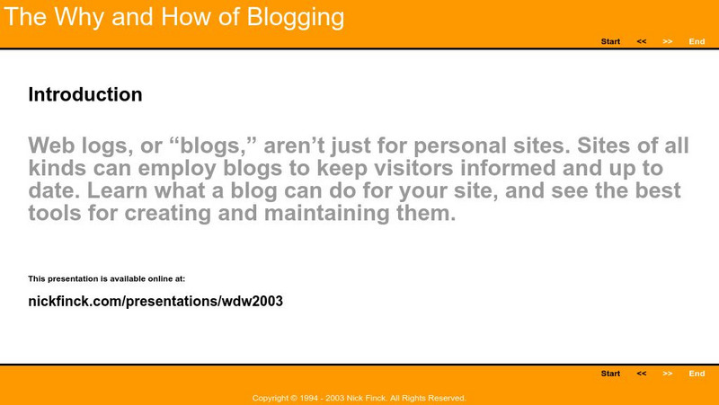 Do you want a simple introduction to blogging? This site utilizes large graphics in a step-by-step format to walk you though what a blog is, some examples of blogs, the tools of blogging, the different types of blogs, and related topics.