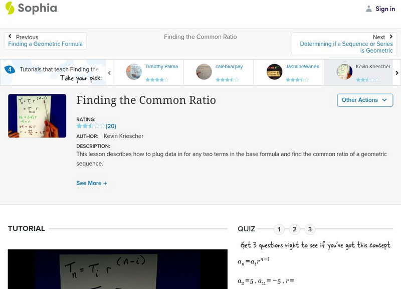 Video introduces geometric sequences explaining what they are and giving examples. Explains what the common ratio is and shows examples using it to write a geometric sequence. Gives example of word problem involving a geometric sequence...