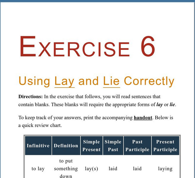 Grammar Bytes: Word Choice: Exercise 6: Using Lay and Lie Correctly