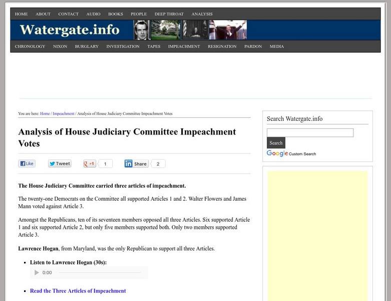 A chart of each of the House Judiciary Committee member's party affiliation and vote on each article of impeachment in the Watergate case.