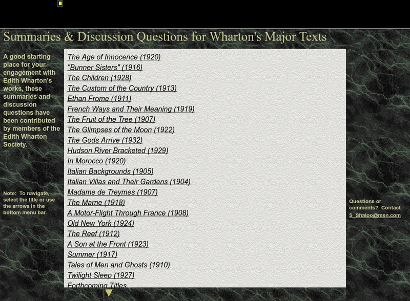 If you need to get a handle on what's important in some of Wharton's major works, this site will be helpful. Summaries and questions are contributed by Wharton Society members from various universities.