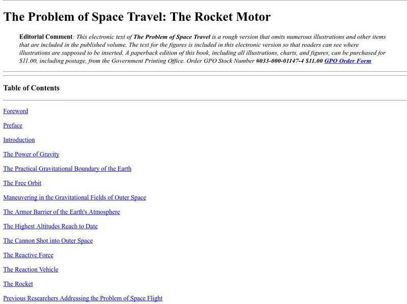 An online version of a book pertaining to task of launching rockets into space and subsequently navigating them through space. The first several "chapters" (pages) describe the influence of gravity on Earth and the barriers which it...