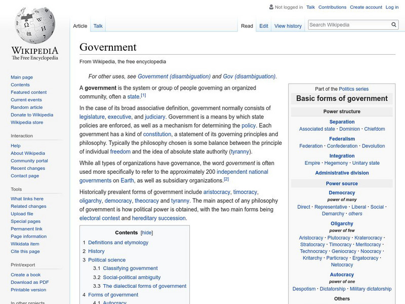 This Wikipedia encyclopedia site examines a wide range of different forms of governments that have been suggested and/or used in practice. Topics include anarchism, autocracies, meritocracies, monarchies, democracies, republics,...