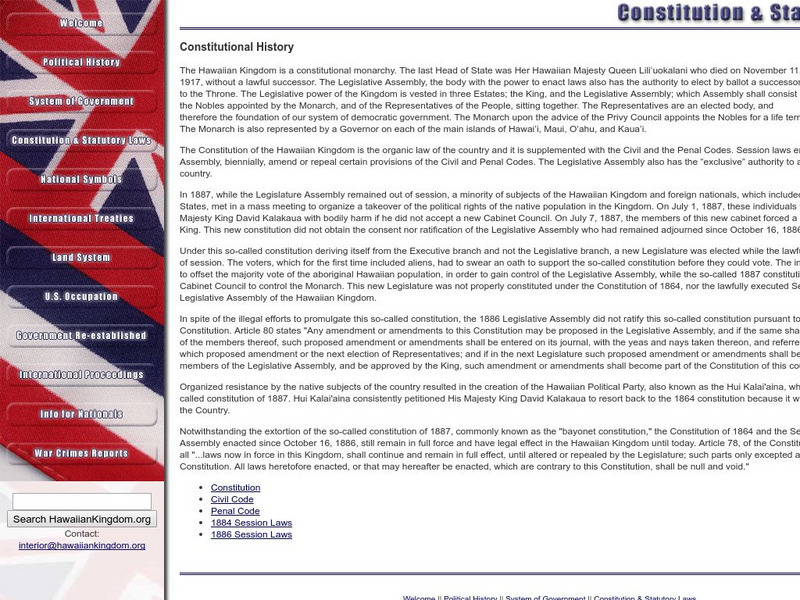 Complete history of the Constitution of the Hawaiian Kingdom with details on the Civil and Penal Codes, Session laws, and the Legislative Assembly.