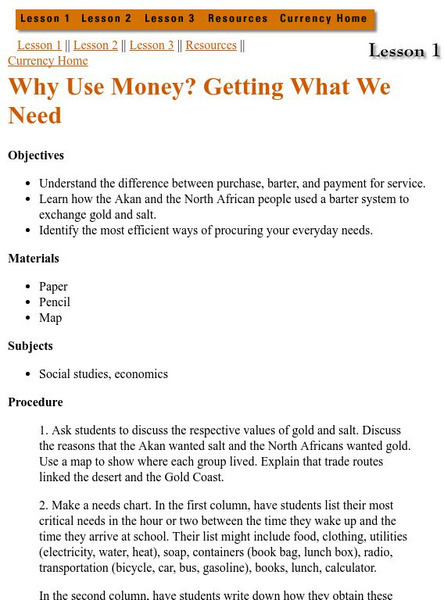 Students will compare and contrast different methods of attaining the everyday items they need. Using the Akan people of Africa as an example of bartering, students will understand three different ways of paying for goods. Discussion...