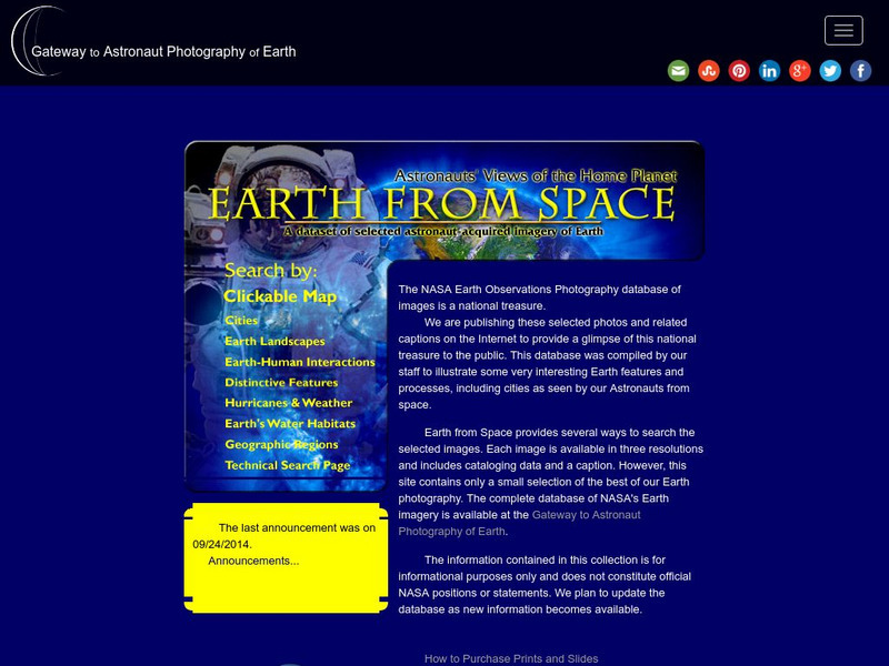 Hundreds of amazing images of Earth from space. This site provides images of geographic regions, landscapes, cities, habitats, distinctive features, and much more. These images are easy to access and are of amazing quality.