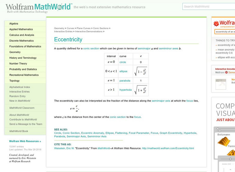 This site explains eccentricity, the quantity defined by a conic section to determine its type of conic section. Has links to related topics.