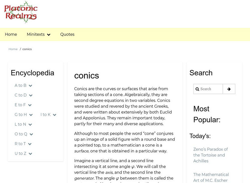 This resource provides in depth information on the conic sections. Click on the underlined words for definitions and diagrams.