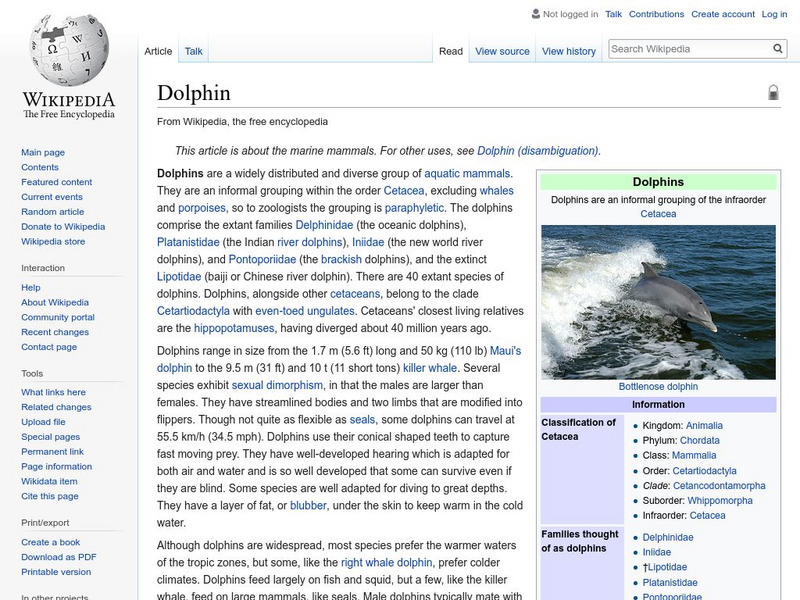 Wikipedia, a free and open-source encyclopedia, provides a detailed overview of dolphins. Content includes a focus on dolphin taxonomy, the evolution of dolphins, dolphin anatomy, dolphin behavior, feeding, dolphin lore, and more.