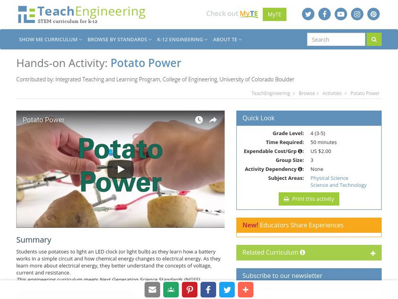 Students use potatoes to light an LED clock (or light bulb) as they learn how a battery works in a simple circuit and how chemical energy changes to electrical energy. As they learn more about electrical energy, they better understand...