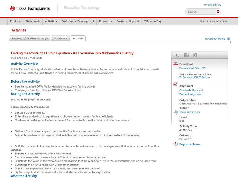 In this Derive activity, students understand how the software solves cubic equations and relate it to contributions made by del Ferro, Tartaglia, and Cardan in finding the method of solving cubic equations.