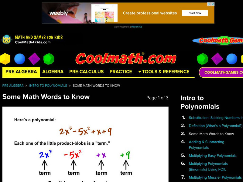 This CoolMath resource provides definitions and example for the following math words: term, polynomial, binomial, mononomial, and degree.