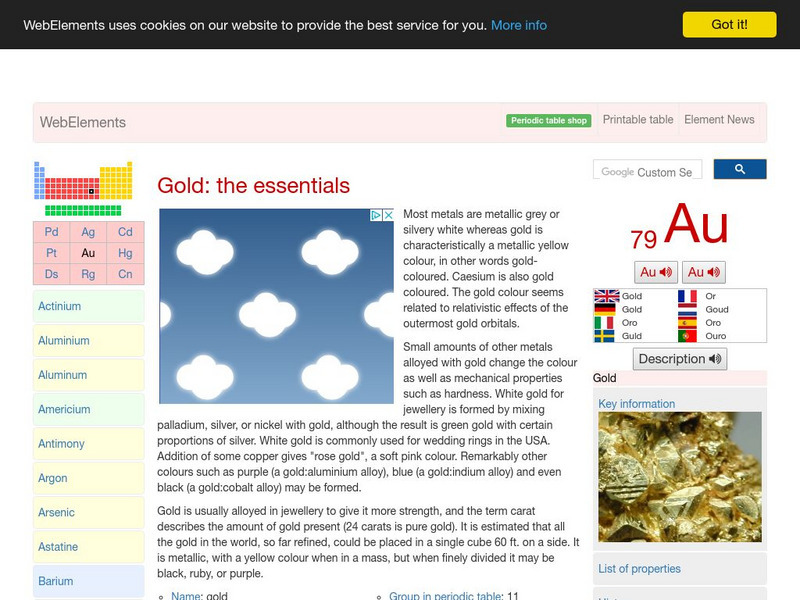 This page gives useful numerical and quantitative information about gold, chemical symbol Au. Includes videos of certain reactions, electronic configuration, and information about the isolation of gold metal.
