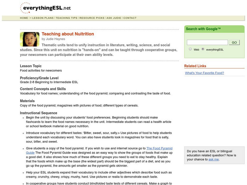 "Nutrition for Newcomers" is a cooperative thematic unit to teach vocabulary for food names, different tastes, and nutrition. It includes many activities for different English levels.